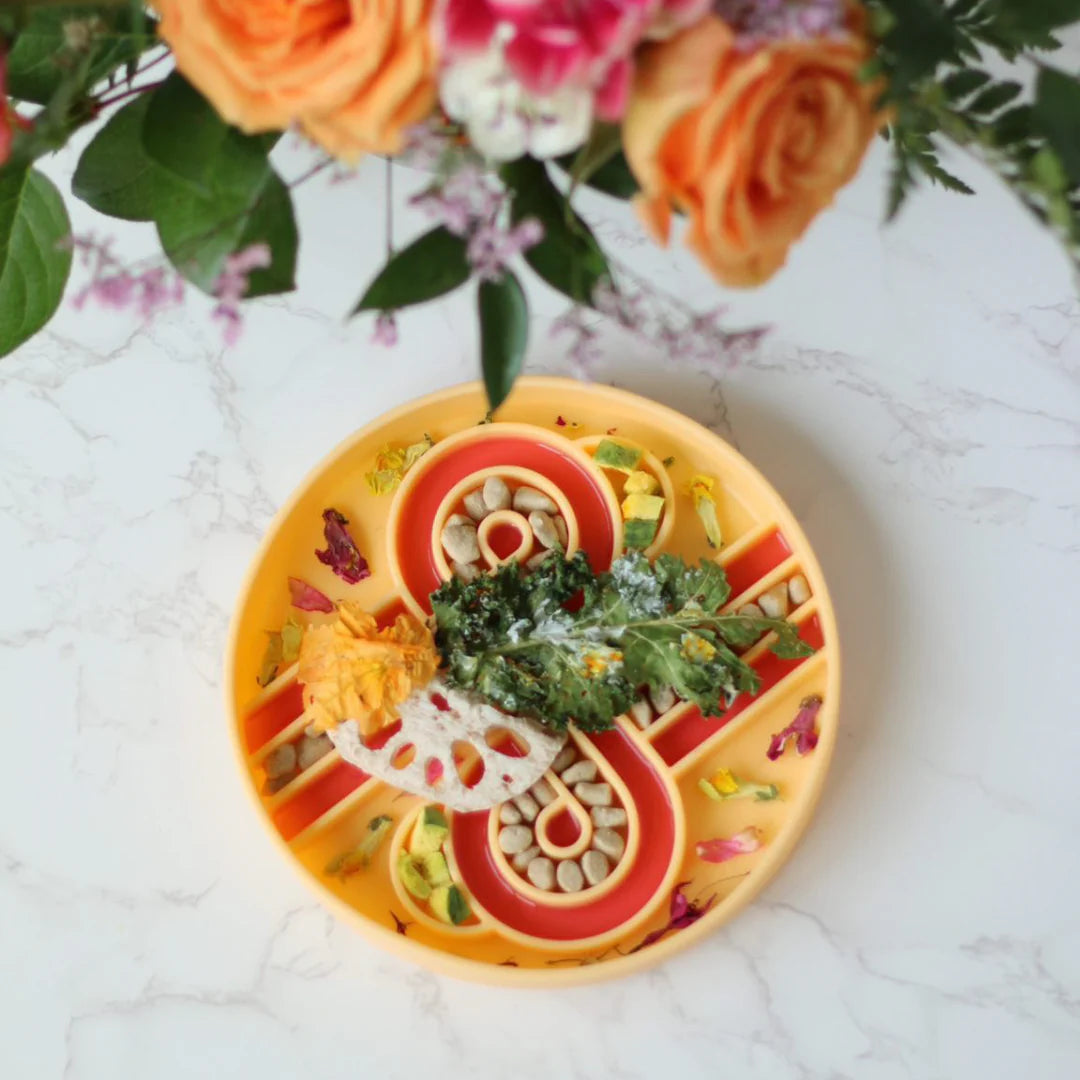 The Zoomies Slow Feeder was designed in-house, keeping all size breeds in mind. Named after it's fun race-track design!